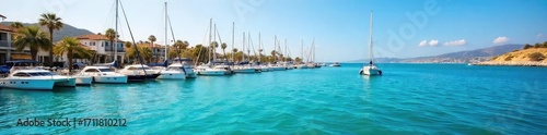 Sun-drenched California marina, sailboats bobbing gently on turquoise water, vibrant coastal landscape Perfect for travel, lifestyle, and nautical themes , sun, peaceful