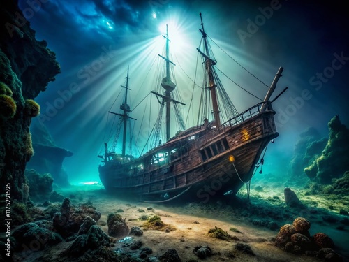Sunken Galleon: Eerie Bioluminescent Underwater Shipwreck Stock Photo