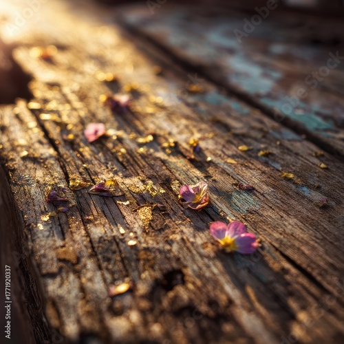 wood, plank, rustic, weathered, aged, old, texture, grain, surface, flower petals, flower, pink, purple, gold, dust, pollen, nature, natural, organic, sunlight, sunbeam, light, warm, glow, sunset, sunrise, serene, peaceful, calm, tranquil, beauty, beautiful, delicate, fragile, ephemeral, nostalgia, nostalgic, memory, imperfection, closeup, macro, detail, selective, sharpened, blur, bokeh