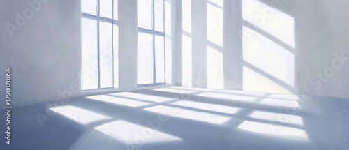 Sunlight casting shadows on a modern empty room with large windows, bright interior design, minimalist decor, space for creativity and inspiration.