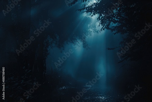 Sunlight filters through dense trees in a dark forest, A soft, ethereal glow seeping through the darkness. AI generated