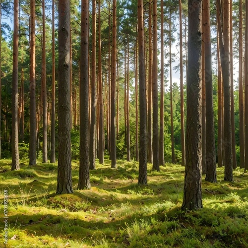 forest, pine, tree, sunlight, nature, green, moss, tranquil, calm, wood, pine, dense, growth, forestry, landscape, calmness, evergreen, shadow, ground