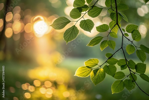 Sunlight filters through translucent green leaves on a tree branch creating a soft bokeh effect in the background during golden hour
