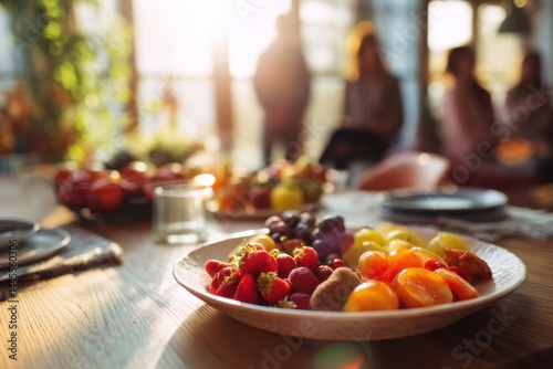 Sunlight Illuminates Delicious Fresh Fruit Platter on Wooden Table, Summer Gathering's Sweet Treats.