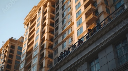 Sunlight illuminates the elegant facade of a tall residential building featuring people gathered on the balcony against a clear sky