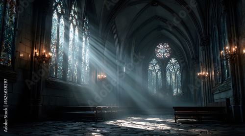 Sunlight rays through a gothic church window in a dark sacred space