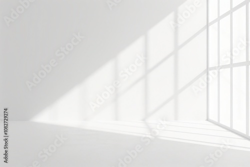 Sunlight streaming through a window in a white room casts long. rectangular shadows on the wall and floor