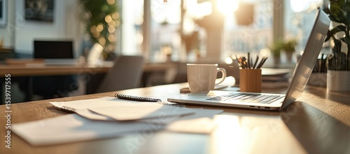 sunlight, desk, paper, laptop, hot drink, cup, wooden, workspace, office, work, modern, natural, bright, morning, afternoon, warm, productivity, focused, organised, clean, simple, cosy, business, technology, design, minimalist, minimalism, calm, quiet, efficiency, professional, open, roomy, relaxed, creative, inspiration, fresh, light, warmth, morning light, coffee cup, workstation