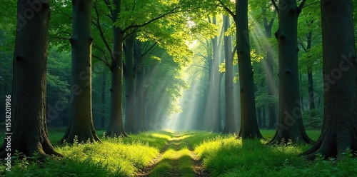 Sunlit Beech Forest Canopy Tranquil Spring Scene of Majestic Trees and Lush Undergrowth, Ideal for Nature and Design Projects
