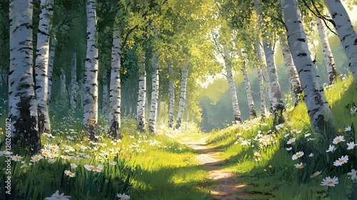 birch, tree, forest, path, trail, sunlight, sun, daisy, flower, white, green, grass, leaf, summer, nature, landscape, scene, idylli, peaceful, serene, tranquil, calm, beauty, vibrant, bright, cheerful, joyful, happy, spring, timberland, wood, meadow, wildflower, flora, botanical, day, light, shade, colours