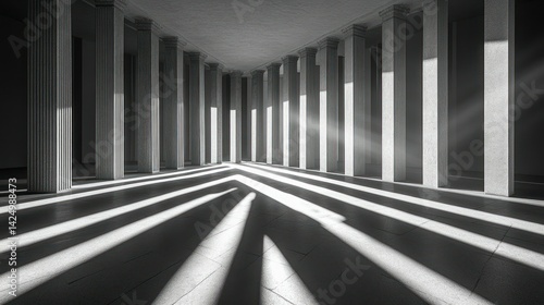 colonnade, sunlight, shadow, column, architecture, interior, light, space, marble, classic, symmetry, empty, perspective, geometric, sunbeam, grey, white, modern, minimalist, hall, corridor, structural, design, daylight, detail, floor, pattern, line, beam, empty space, clean, simple, elegant, photo, black-and-white, greyscale, interior design, art, photographic, wide