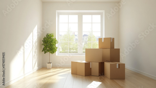 room, empty, box, cardboard, sunlight, window, sun, light, interior, house, home, apartment, moving, relocation, space, floor, wood, plant, tree, green, white, wall, bright, clean, new, modern, minimalist, design, simple, blank, packing, storage, residential, real estate, property, building, day, cosy, calm, peaceful, orderly, neat, organised, habitation, dwelling