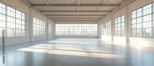 interior, warehouse, empty, space, room, building, architecture, design, modern, industrial, light, window, sun, sunlight, daylight, ceiling, floor, wall, white, bright, roomy, open, large, panoramic, view, clean, minimalist, loft, studio, event, exhibition, gallery, office, commercial, property, real estate, photo, background, texture, perspective, horizon, shadow, beam, pane