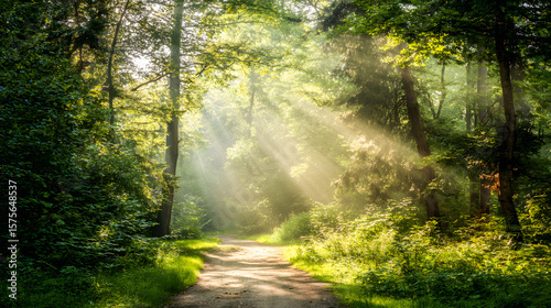 Sunlit forest path with golden rays through trees, a serene nature escape