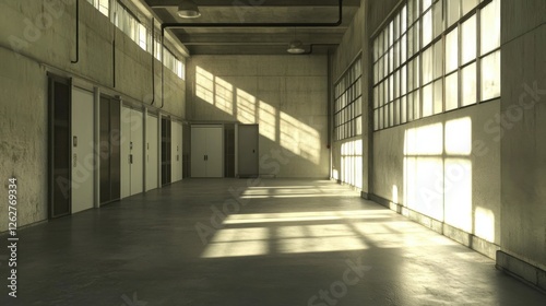 industrial, corridor, interior, architecture, building, concrete, sunlight, window, shadow, wall, door, light, space, modern, design, warehouse, factory, hallway, empty, room, perspective, line, geometric, pattern, texture, clean, minimalist, simple, austere, muted, tone, calm, peaceful, serene, roomy, expansive, bright, airy, huge, open