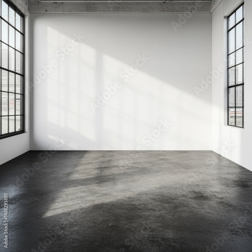 loft, industrial, space, room, sunlit, sunlight, shadow, window, large, concrete, floor, polished, wall, white, empty, minimalist, interior, design, architecture, modern, clean, simple, roomy, bright, airy, open, plan, high, ceiling, view, urban, warehouse, factory, renovated, stark, texture, grunge, smooth, grey, dark, light, contrast, perspective, huge, setting, scene, photo