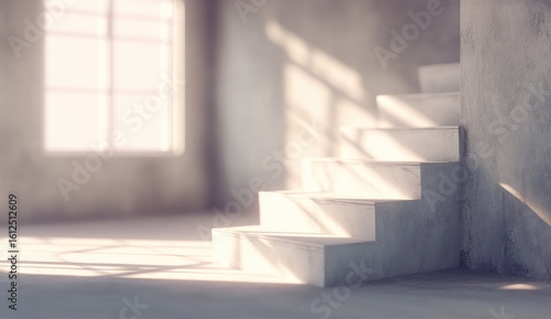 sunlit, minimalist, interior, concrete, staircase, stair, step, light, shadow, window, room, space, architecture, design, modern, simple, clean, bright, airy, calm, serene, peaceful, tranquil, quiet, empty, huge, roomy, muted, pale, soft, gentle, subtile, texture, wall, floor, ascent, descent, perspective, depth, image, photograph, rendering, three-dimensional, art, style, aesthetic, ambience, atmosphere