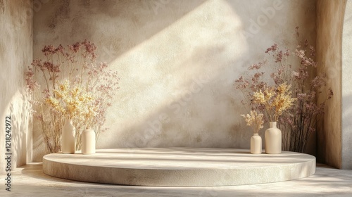 minimalist, studio, background, display, presentation, beige, neutral, earth-tone, dried flowers, floral arrangement, vase, pottery, platform, dais, sunlight, sunbeam, shadow, texture, wall, concrete, rustic, vintage, bohemian, aesthetic, calm, serene, peaceful, elegant, sophisticated, modern, contemporary, clean, simple, branding, marketing, advertising, e-business, template, design, interior, home decor, still life, autumn