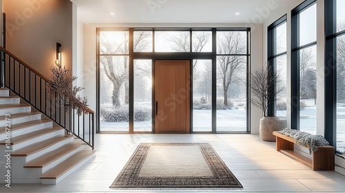 Sunlit modern foyer with wooden front door and floor-to-ceiling windows overlooking a snowy yard, minimalist staircase, rug, bench and potted branches creating a calm inviting atmosphere