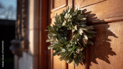 Sunlit olive wreath hangs on rustic wooden door, evoking midwinter tranquillity and Yule tidings, symbolizing renewal and peace