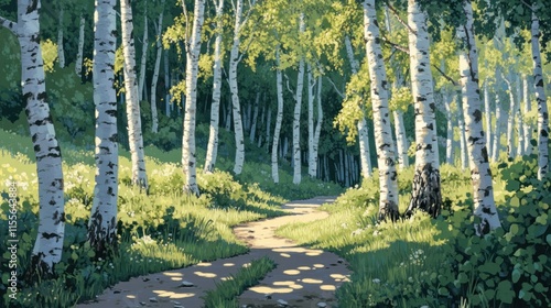path, forest, tree, birch, wood, sunlight, sun, summer, green, nature, landscape, scenery, environment, trail, way, road, walk, journey, travel, exploration, leaf, grass, plant, flora, light, shadow, peaceful, serene, calm, tranquil, beauty, scenic, idylli, picturesque, relaxing, vibrant, bright, day, spring, ecology, wilderness, timberland, vegetation, background, image, photo