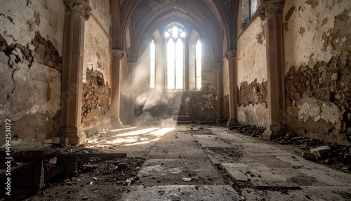 Sunlit Ruin Gothic Church Interior with Dust Motes and Stained Glass