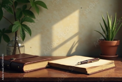 Sunlit Still Life Leather Journal, Open Book, and Fountain Pen Resting on a Wooden Surface, Near Greenery