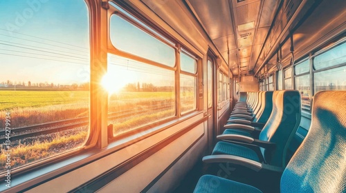 train, railway, sunset, sun, landscape, window, view, seat, interior, travel, journey, transport, transportation, summer, gold, light, bright, scenic, countryside, rural, field, nature, horizon, sky, rail, track, passenger, carriage, coach, compartment, empty, sunshine, day, afternoon, morning, serene, calm, peaceful, relaxing, warmth, comfort, elegance, style, design, roomy, clean, modern, wide