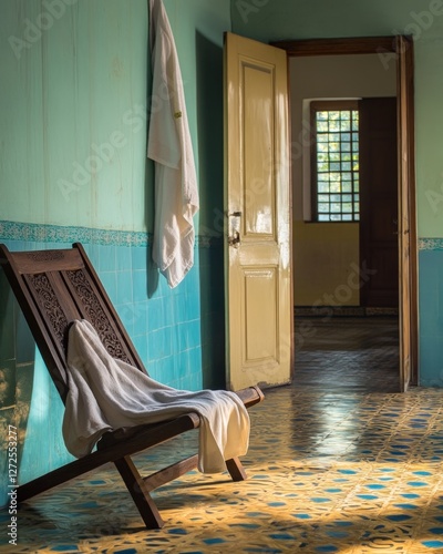 bathroom, interior, vintage, teal, tile, wooden chair, towel, sunlit, light, room, house, home, building, architecture, design, old, antique, rustic, worn, textured, white, blue, yellow, floor, wall, door, window, bright, calm, serene, peaceful, tranquil, quiet, stillness, atmosphere, mood, old house, retro, classic, style, aesthetic, decoration, interior design, photo