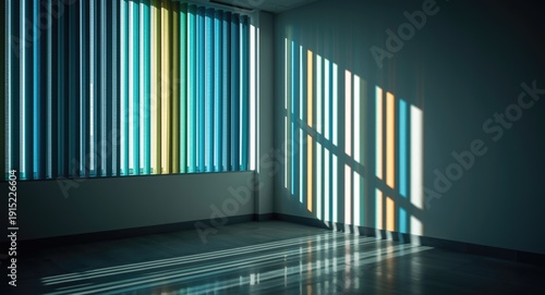 Sunlit work area featuring colorful vertical blinds and shadow patterns