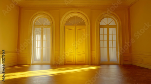 Sunlit Yellow Room 3D Render: Arched Windows and Doors