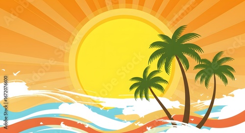 sun, beach, palm, tree, ocean, wave, summer, vacation, tropical, background, landscape, sea, sky, nature, travel, paradise, holiday, coast, island, sunlight, horizon, shore, blue, orange, sand, sunrise, design, illustration, graphic, resort, tour tourism, sunny, coastline, cloud, vector, relax, peaceful, warm, scenery, get-away, sunshine, bright, caribbean, exotic, serene