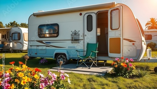 Sunny caravan park with cozy trailer, terrace, and colorful flowers, radiating relaxation.