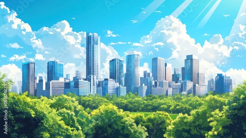 city, skyline, urban, landscape, park, green, tree, nature, summer, sun, sky, cloud, building, skyscraper, architecture, modern, sunlight, bright, day, view, horizon, metropolis, downtown, environment, ecology, fresh, vibrant, scenic, beautiful, peaceful, calmness, oasis, harmony, idylli, clean, growth, leafy, tower, highrise, development, urbanisation