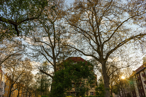 apartment, architecture, berlin, building exterior, building, city, park, sky, street, sunny, sunset, tenement, tree, urban