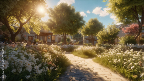 Sunny Garden Path with Blooming Flowers and Trees in a Peaceful Residential Courtyard