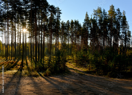 forest, sun, pine tree, nature, sunlight, tree, landscape, colours, countryside, needle, pine, spruce, grass, morning, space, green, pattern, autumn, light, plant, travel, forest road, branch, leaf, beauty, dawn, season, tree, shrub, foliage, sunrise, background, path, solar, root, conifer, calm, bark, road, stone, wood, flare, heather, moss, lichen, cone, birch