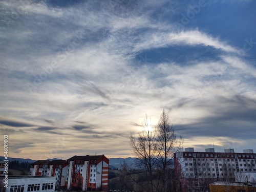 Sunrise and sunset, beautiful clouds over the meadow, hills and buildings in the town. Slovakia