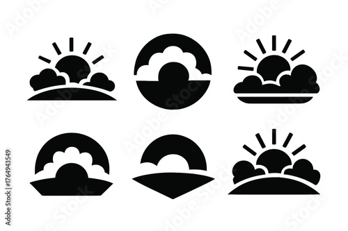 Sunrise Horizon Logos. Sunrise Peeking Through the Clouds. Set Logo of Horizon Line: Filled silhouette, Abstract geometric, Negative space, Flat solid,