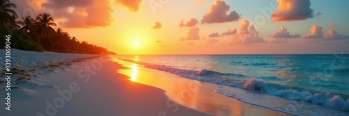 Sunrise illuminates Cancun beach, soft light on wet sand, clear sky , horizon, coast, beach
