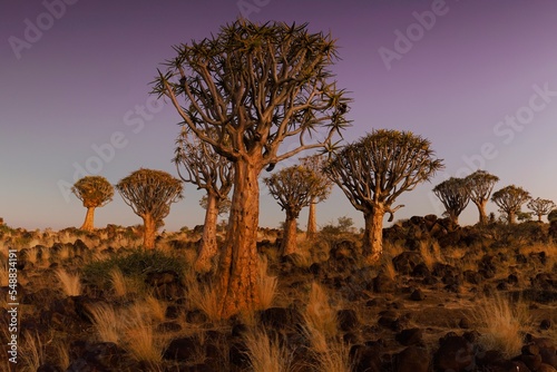 Sunrise in desert landscape of Quiver Tree Forest (Aloe dichotoma), Namibia, South Africa