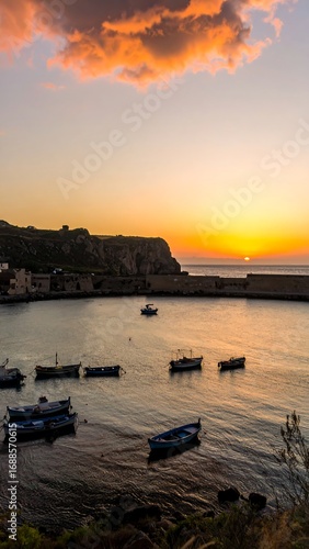 sunrise, harbor, boat, rocky, coast, ocean, water, cloud, calm, gold, orange, sky, morning, sea, ship, fishing, cliff, town, silhouette, light, warm, colours, coastal, tranquil, beauty, nature, view