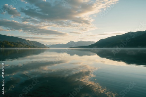 Sunrise over a tranquil mountain lake with mirrored water and serene hills