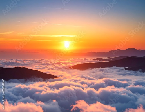 sunrise, mountain, cloud, sky, gold, vibrant, hazy, serene, majestic, breathtaking, view, panorama, aerial, sunset, horizon, colourful, peaceful, nature, landscape, mountainous, top, viewpoint, foggy, high, altitude, warm, light, dramatic, fluffy, soft, pink, orange, yellow, calm, amazing, spectacular, beautiful, morning, afternoon, illumination, shadow