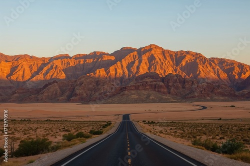 Sunrise over rocky peaks and desert sands on a scenic journey
