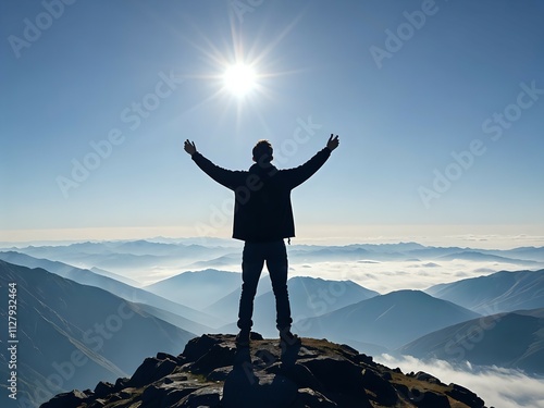 Sunrise, silhouette of a person standing on the top of a mountain.