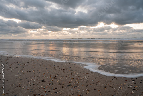 sunset above a cloudy beach with shells