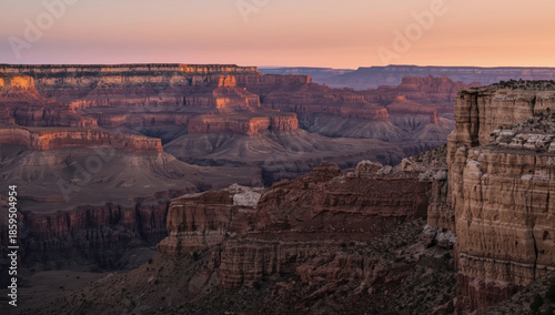 Sunset canyon landscape with layered sandstone cliffs and soft pastel sky