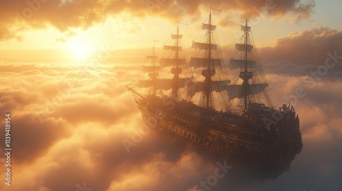 ship, sailing, sunset, cloud, sky, ocean, sea, cloudscape, galleon, sun, gold, light, fantasy, dreamscape, adventure, travel, voyage, horizon, majestic, beautiful, aerial, view, up high, high, gold, dramatic, aethereal, mystical, magical, romantic, peaceful, serene, calm, tranquil, hope, freedom, discovery, exploration, journey, sailing vessel, vessel, antique, vintage, old