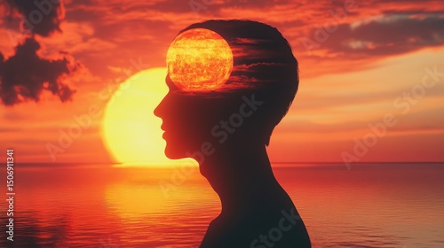 sunset, profile, head, silhouette, sun, sky, cloud, horizon, ocean, water, peaceful, meditation, mind, sharpened, contemplation, inspiration, abstract, art, image, design, creative, colours, vibrant, orange, red, warmth, calmness, energy, person, human, nature, beauty, digital, surreal, imagination, thought, vision, cosmos, sunrise, moon, light, glow, power, artistic